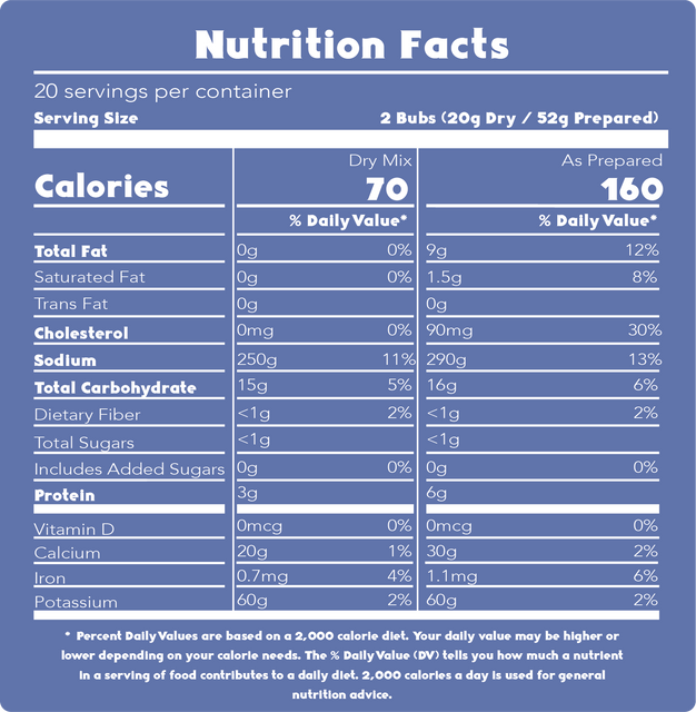 NOTE: Bubs come as a dry mix, just like any other matzo ball mix. You'll need 1 egg and 1 tablespoon of oil for every 4 Bubs you make. This bag has 10 scoops of dry mix, making 40 Bubs.